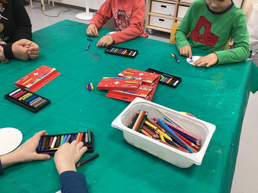 Punainen ja sininen violetin taikoi. Liitukynä uudelleen väritellä aikoi.Sininen ja keltainen vihreäksi muuttui...keltainen punaista halasi ja oranssiksi muuttui.