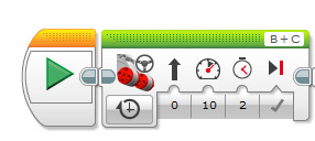 Kiihdytys ja jarrutus Ohjelmoi robotti liikkumaan aluksi hiljaa, sitten kovaa ja taas hiljaa Move Steering -palikan avulla. Robotti liikkuu suoraan (suunta 0) nopeudella 10 kahden sekunnin ajan.