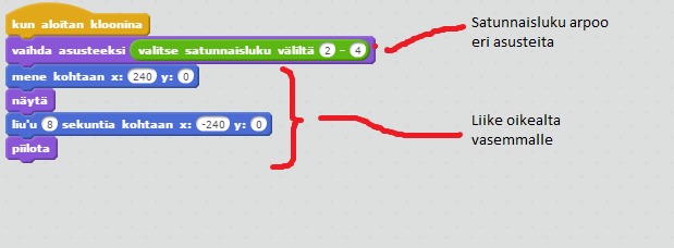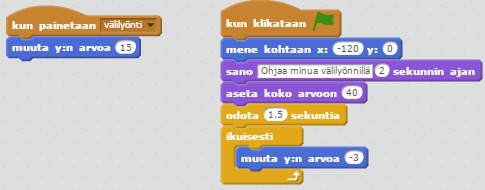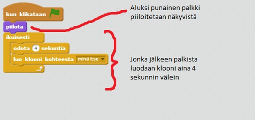 5. Lisää viimeiseksi Ikuisesti-silmukka, jonka sisälle laita ehto, joka lopettaa pelin kun lentävä hahmo osuu palkkiin.