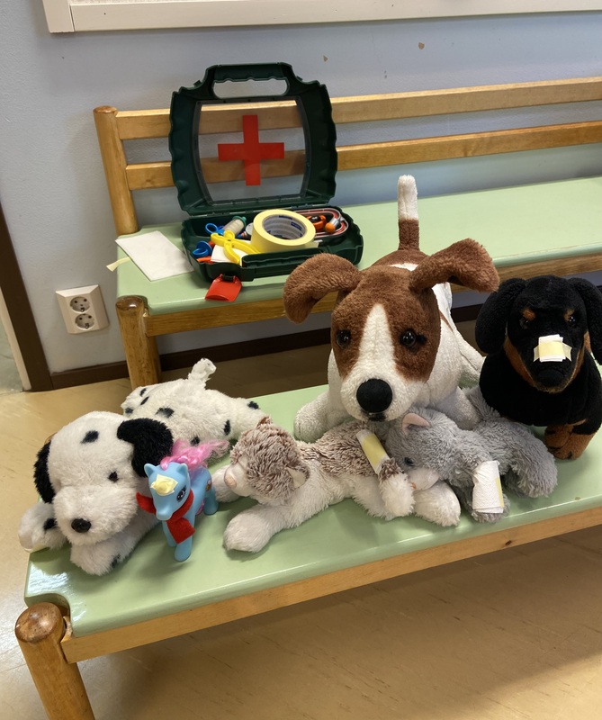 Tämän kuvan tekstivastine: Penkillä rivissä erilaisia pehmoleluja ja poneja, penkin takana lääkärinlaukku jossa lääkärileluja.