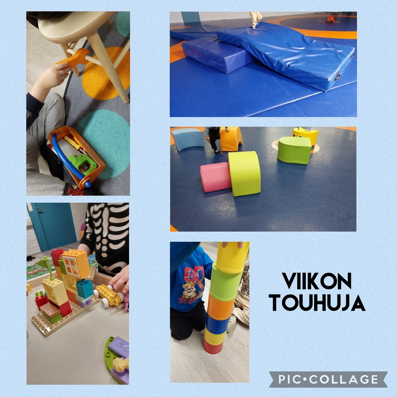Viikon aikana teimme mm. rakenteluleikkejä. Jumpalla kiipeilimme ja hypimme patjoilla, rakensimme torneja matopaloilla ja kiipeiltiin palojen päällä.