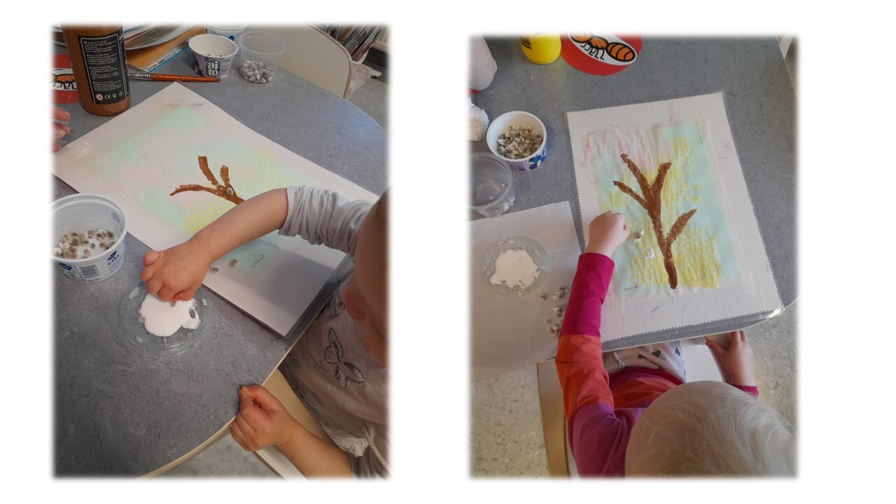 Aloitettiin lasten kanssa lumpeenlehti-askartelu. Lapset tupsuttelivat maalia lumpeenlehteen :)