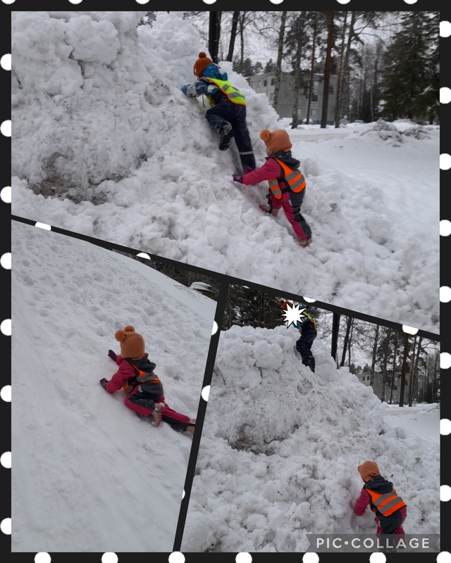 Lumileikeissä on viihdytty tällä viikolla. Liikuntaa on totisesti saatu lumitöitä tehden, lumessa kierien ympäri pihaa, omassa pienessä pulkkamäessä, sekä vesilaitoksen mäessä, jossa saakin kiivetä ylös korkealle kerta toisensa jälkeen. Kurahousuissa saa hyvät liu'ut, siellä ei tarvita liukureita, ei pulkkaa. Samalla reissulla meillä oli eväsretki Suvin ja Mian kanssa.