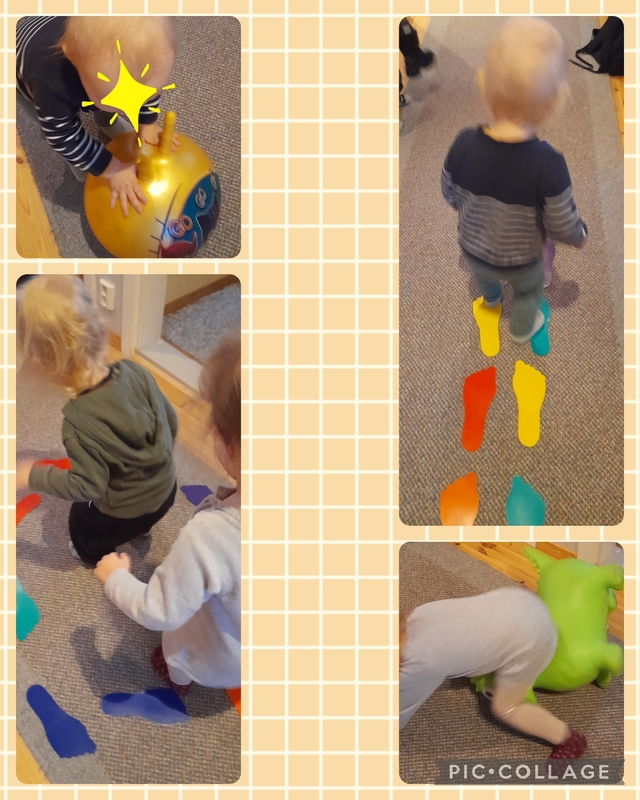 Riemukasta pomppimista dinolla ja pomppupallolla.