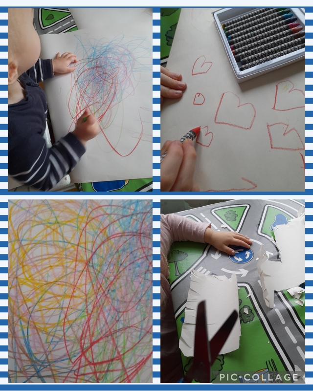 Kädentöitä uusilla liiduilla piirtäen ja saksilla leikaten. Kyllä tuli hienoa jälkeä! Tällä viikolla ollaan maalattu ahkerasti myös vesiväreillä ja peiteväreillä.