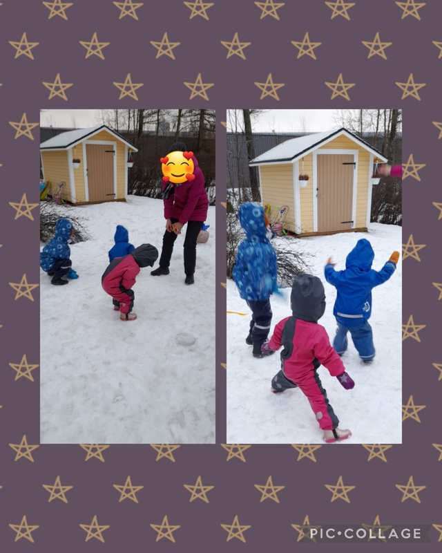 Lumisadeaamuna menimme ihan uuteen paikkaan leikkimään. Lapset siirtelivät lumikökkäreitä ja rakensivat niistä kasoja. Välillä jonkun kenkäkin meinasi jäädä jumiin kun oli niin paljon upottavaa lunta.