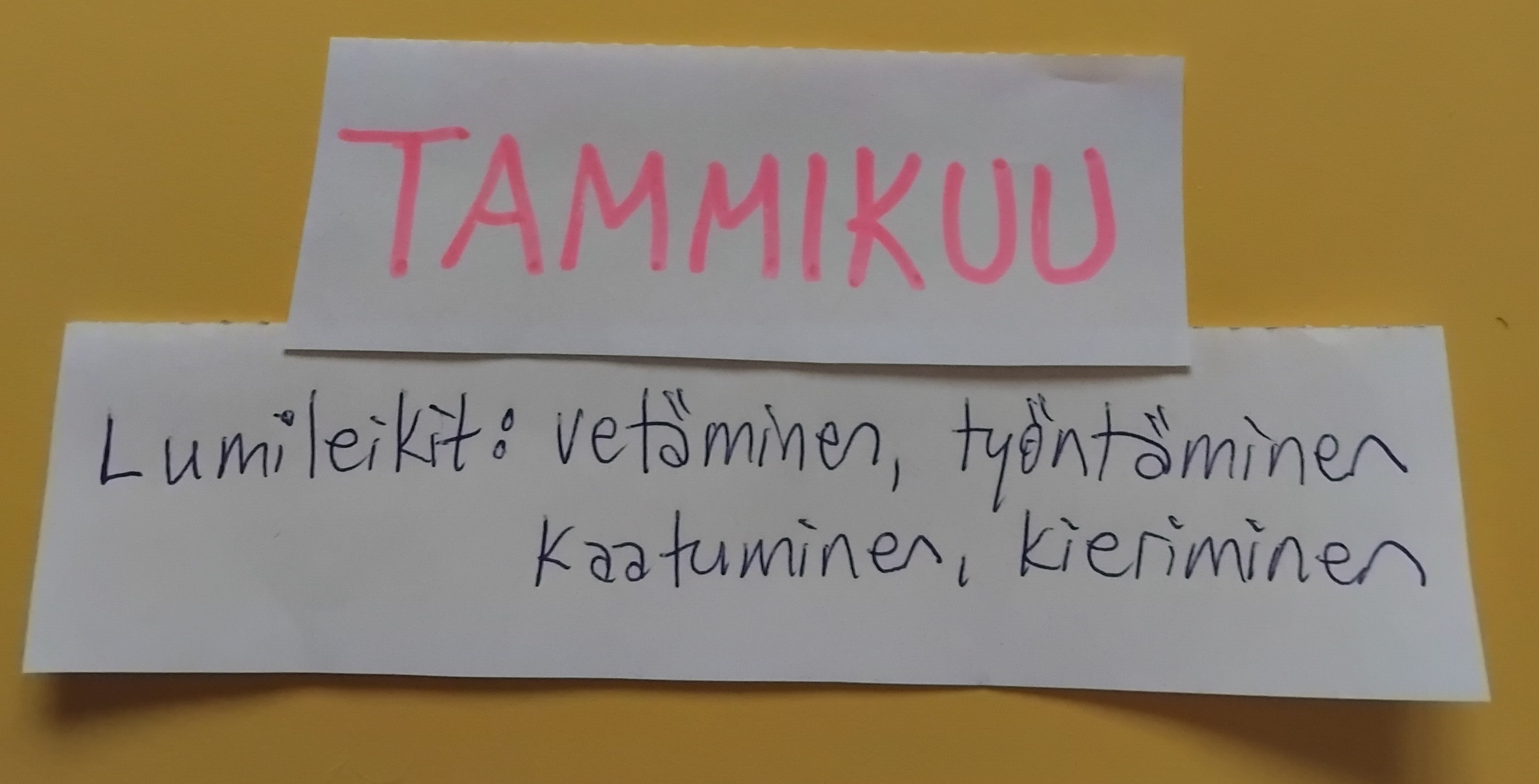 Uusi vuosi lähti mukavasti käyntiin, muistelimme joulun aikaa ja rakettipäivää, sekä suunniteltiin tulevaa kyselemällä ruokatoiveita, aamupala -ja välipalatoiveita ja lasten vinkkejä tekemisiin, leikkeihin jne. Tammikuun liikuntasuunnitelmassa on lumileikit, joihin vetäminen ja työntäminen kuuluvat. Ensimmäisessä kuvassa näkyy, että pulkissa on vedetty kavereita ja intoa on niin, että välillä meinaa tulla jopa kinaa siitä kuka saa kenetkin pulkan kyytiin.