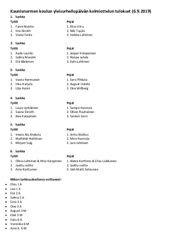 Kaunisnurmen koulun yleisurheilupäivän kolmiottelun tulokset Jaa Sulje Tämän tiedoston tekstivastine: (tyhjä tekstivastine) Yleisurheilukisojen kolmiottelun tulokset_6.9.19.pdf 346.8 kt