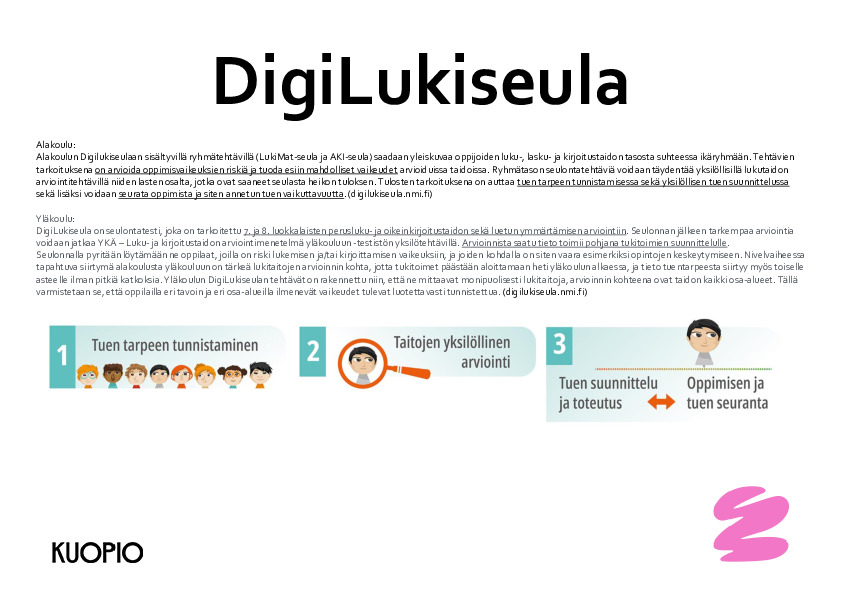 Kasvatus- ja koulutuspoliittisen ohjelman mukaisesti Kuopion kaupungissa ryhdytään lukuvuosittain seulomaan vuosittain 3., 5. ja 7. luokkalaisten oppilaiden lukitaitoa sekä 3. ja 5. luokkalaisten matemaattisia perustaitoja Niilo Mäki Instituutin Digilukiseulan avulla. Digilukiseulan avulla saamme kaupunkitasoisesti tietoa Kuopion kaupungin oppilaiden lukitaitojen sen hetkisestä tilanteessa, jotta kouluissa voidaan suunnitelmallisesti huomioida ja tukea oppilaiden luki- ja matemaattisia perustaitoja. Pidemmällä aikavälillä saamme tilastollisesti tärkeää tietoa lukitaitojen ja suunnitelmallisesti kohdistetun tuen vaikuttavuudesta sekä oppimisen tukemisen kohdentumisesta.