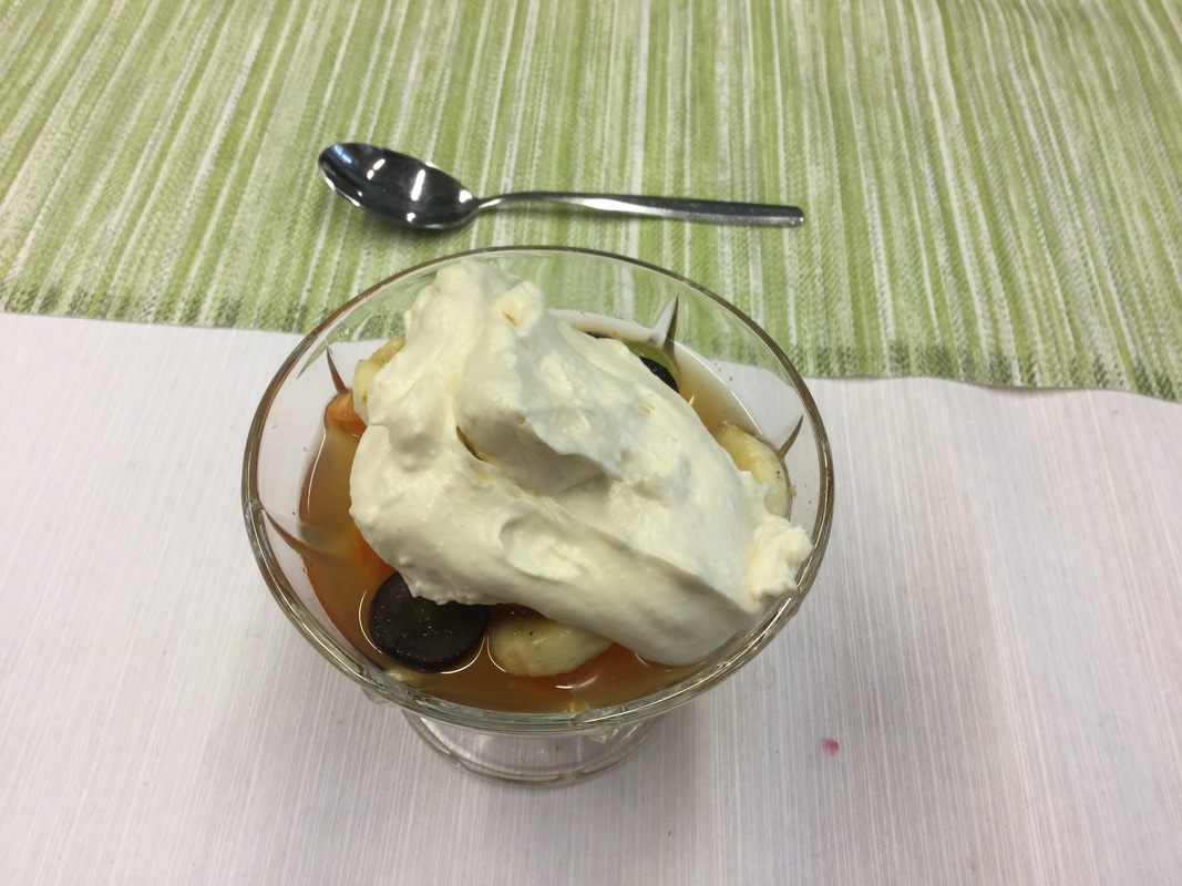Katkarapuja tomaattikastikkeessa, karitsamoussaka sekä marinoituja hedelmiä ja halvavaahtoa
