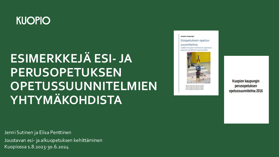 Tiedostossa on koonti Oma oppimispolku - toimintamallista rehtoreiden ja johtajien roolin näkökulmasta ajatellen. Esille on tuotu Kuopion joustavan esi ja alkuopetuksen periaatteet: pitkäkestoiset heterogeeniset pikkutiimit, leikki, leikillisyys ja toiminnallisuus, omatahtisuus ja johdon rooli; Mitä asioita johto tekee ja