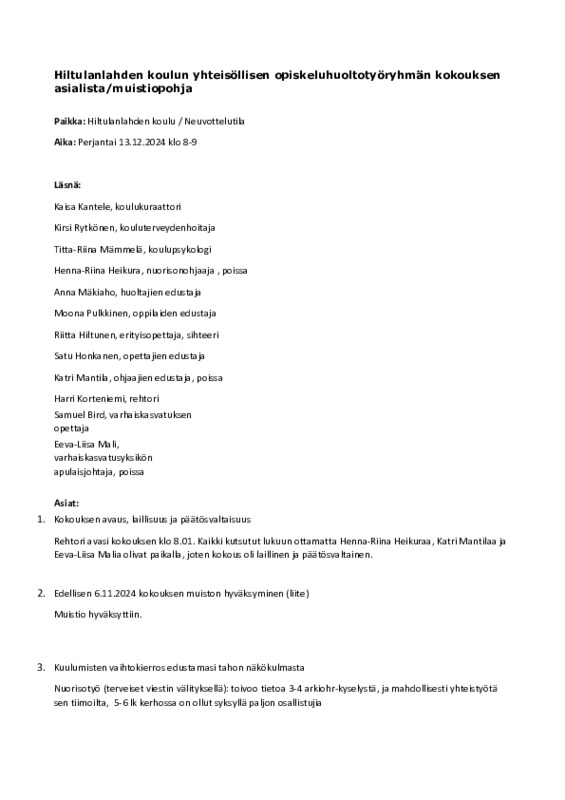 Yhteisöllinen ohr muistio 13.12.2024.pdf Jaa Sulje Tämän tiedoston tekstivastine: (tyhjä tekstivastine) Yhteisöllinen ohr muistio 13.12.2024.pdf 107 kt