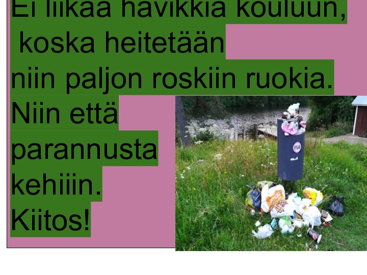 Ilmasto lämpenee ja puut kuolee. Kukaan tahdo sellaista ei, kun se meiltä hengen vei. Ei kasvit enää maassa kasva, kukkasetkin kuolla saattas. Jos sä tän estää tahdot, muista viedä roska pallot.