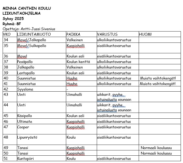 Antti-Jussi Sivenius Jaa Liikunnan arviointi Katselutila 7-luokkien liikuntaohjelmat, syksy 2025 7C liikuntaohjelma syksy 2025.jpg 7C liikuntaohjelma syksy 2025.jpg 118.9 kt 7J liikuntaohjelma syksy 2025.jpg 7J liikuntaohjelma syksy 2025.jpg 123.1 kt 8-luokkien liikuntaohjelmat, syksy 2025 Kopioi 8C liikuntaohjelma syksy 2025.jpg 8C liikuntaohjelma syksy 2025.jpg 123 kt 8F liikuntaohjelma syksy 2025.jpg 8F liikuntaohjelma syksy 2025.jpg 118.2 kt 8J liikuntaohjelma syksy 2025.jpg 8J liikuntaohjelma syksy 2025.jpg 122 kt 8L liikuntaohjelma syksy 2025.jpg 8L liikuntaohjelma syksy 2025.jpg 119 kt Pitkä valinnainen 8lk syksy 2025.jpg Pitkä valinnainen 8lk syksy 2025.jpg 120 kt 9. luokkien liikuntaohjelmat, syksy 2025 9A liikuntaohjelma syksy 2025 .jpg 9A liikuntaohjelma syksy 2025 .jpg 116.8 kt 9L liikuntaohjelma syksy 2025.jpg 9L liikuntaohjelma syksy 2025.jpg 118.1 kt Pitkä valinnainen 9lk syksy 2025.jpg Pitkä valinnainen 9lk syksy 2025.jpg 121.3 kt