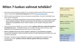 Valinnaisuutta on 8. luokalla kuusi vuosiviikkotuntia ja 9. luokalla viisi vuosiviikkotuntia. Oppilaan osallistuminen painotettuun opetukseen (musiikki, tanssi) vähentää muuta valinnaisuutta. Painotusluokilla opiskelevat oppilaat voivat valita vain yhden lyhyen valinnaisaineen 8. ja 9. luokalla. Oppilaan A1-saksan, A2-kielen tunnit sisältyvät valinnaisaineiden tunteihin.