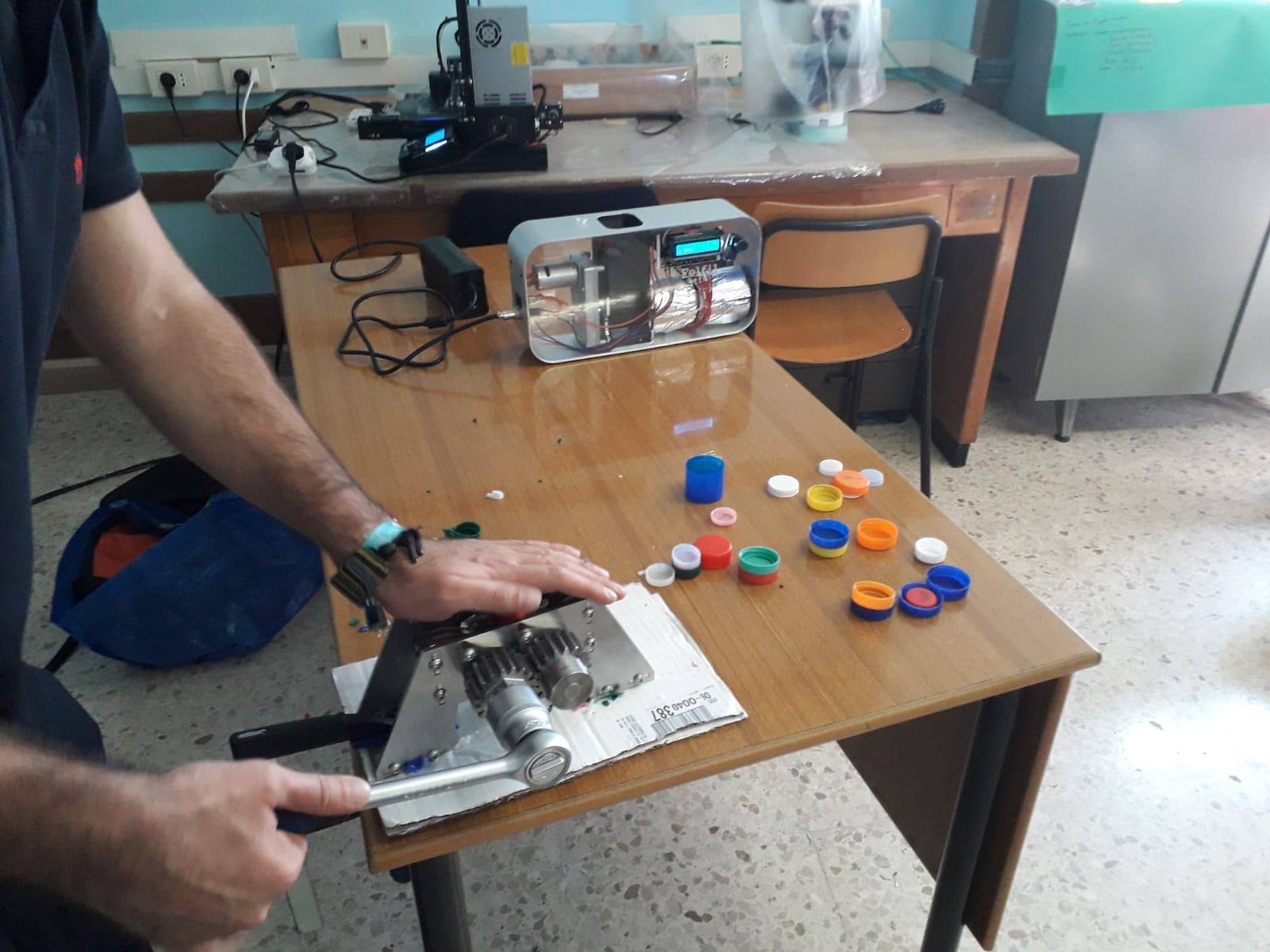 I tappi in PET che i ragazzi hanno portato vengono sminuzzate.
