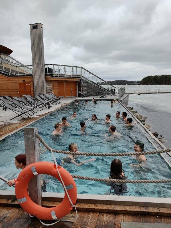 Ruuan jälkeen lähdimme bussilla kohti Kuopion Saanaa klo 13.30. Ajatus saunaan menemisestä oli monelle jännittävä, mutta lopulta lähes kaikki olivat saunassa. Saanassa vietimme aikaa käyden erilaisissa altaissa, savusaunassa, (jotkut uskaltautuivat avantoon) ja tavallisessa saunassa. Saunan jälkeen monen oli olo hyvin rentoutunut.