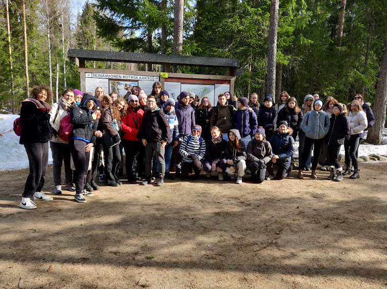 2. päivä 26.4: Tiistaina lähdettiin klo 9.00 bussilla kohti Kuopiota. Saavuimme Puijon tornille noin kello 10.00, jonka jälkeen lähdimme kävelemään Puijon polkuja pitkin. Maassa oli lunta ja jäätä, joka tuotti välillä vaikeuksia. Tämän jälkeen vierailimme Puijon tornissa ja katseltiin upeita maisemia. Kuopion metsäiset maisemat ja harvassa olevat asuinrakennukset antoivat ihmettelemisen aihetta monelle. Söimme lounasta Puijon Majassa, josta löytyi monenlaista lajia ja ihana jälkiruoka.