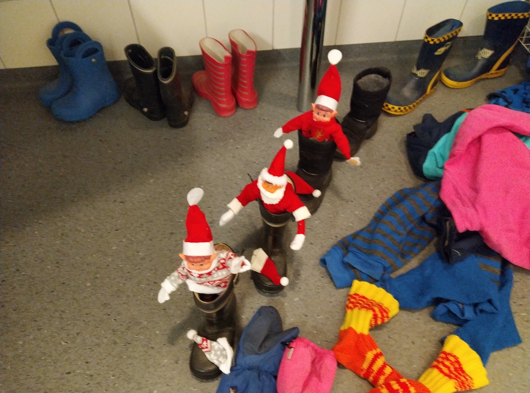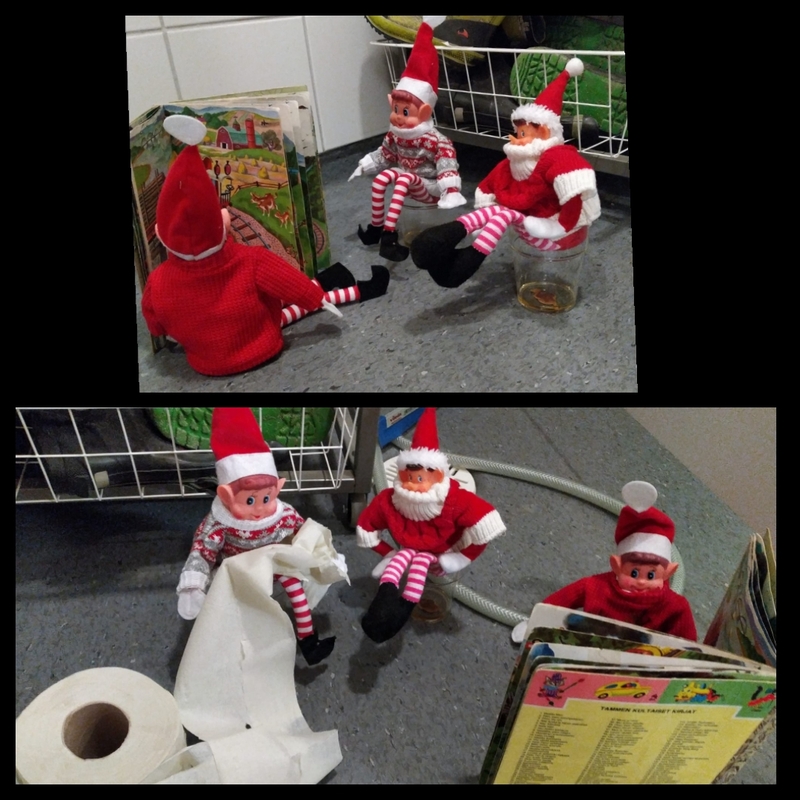 Voi sitä ilon, innostuksen ja pulinan määrää mikä alkoi kun töihin meni. Jokainen lapsi halusi kertoa mistä tonttukolmikko oli tänään löytynyt. Piilo leikkiä olivat leikkimässä, yksi vessassa wc paperi rullien keskellä, toinen tukkinut itsensä kukkamaljakon sisään ja kolmas oli kiivennyt lukunurkkauksen puuhun. Millähän ihmeellä se sinne on päässyt, ihmeteltiin kovasti.