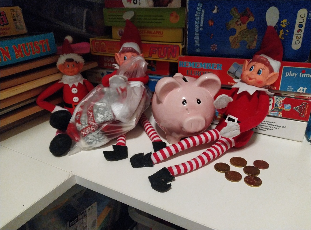 Tonttukolmikko oli laittanut eilen hankkimansa villapaidat päälleen ja olivat ilmeisesti etsineet itselleen kenkiä ja muita vaatteita, että tarkenesivat ulkoilemaan. Taidettiin kuitenkin keskeyttää hommat, koska matka ulos oli jäänyt kesken.