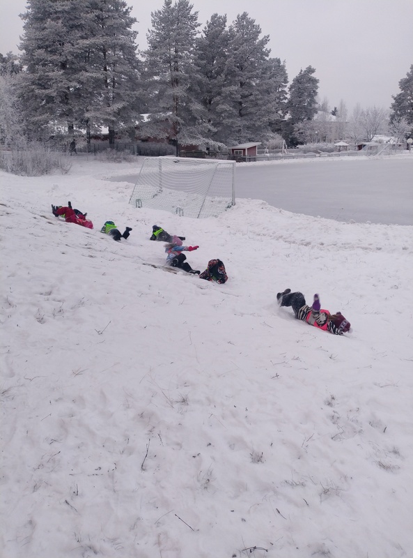Kynttiläkirkkoon reippailimme pakkassäästä huolimatta kävellen. Takaisin tullessa jäimme hetkeksi ulkoilemaan takapihan rinteeseen, jossa lapsilla oli hauska kieriä ja hypellä.