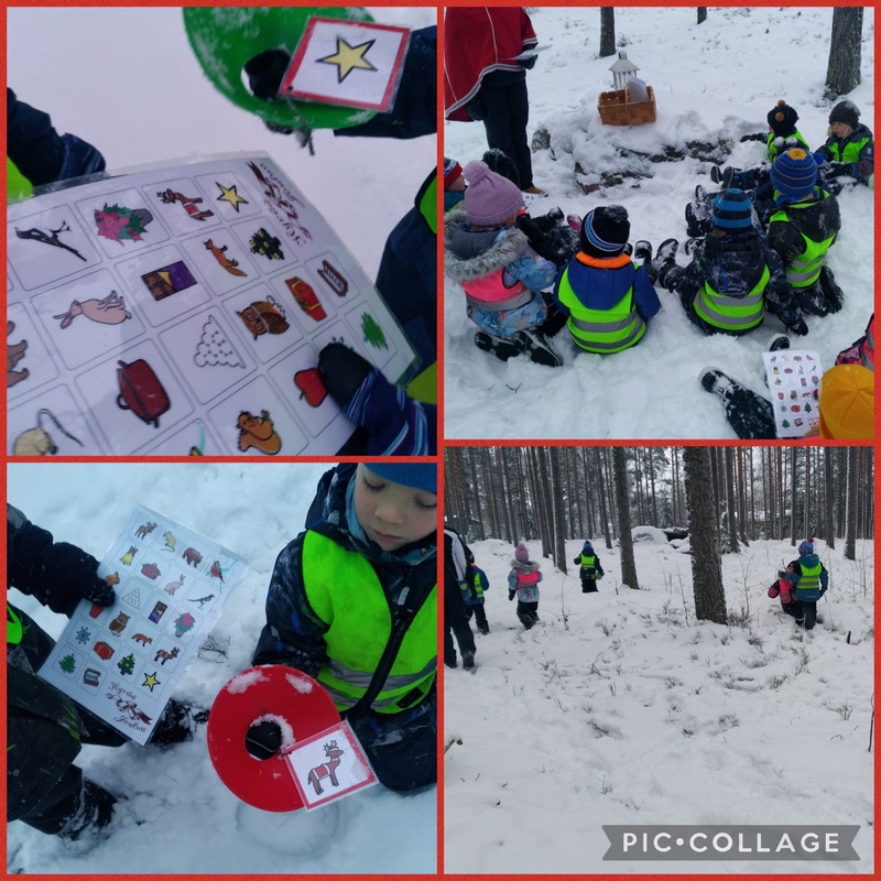 Kahden lapsen toiveena oli metsäliikkari ja metsäleikit, joten menimme metsään joulujahtiin, jossa jokainen ensin kuunteli sadun Joulu metsän väelle. Sitten lapset etsivät pareittain metsästä samat kuvat kuin kortissa. Lopuksi lapset leikkivät.
