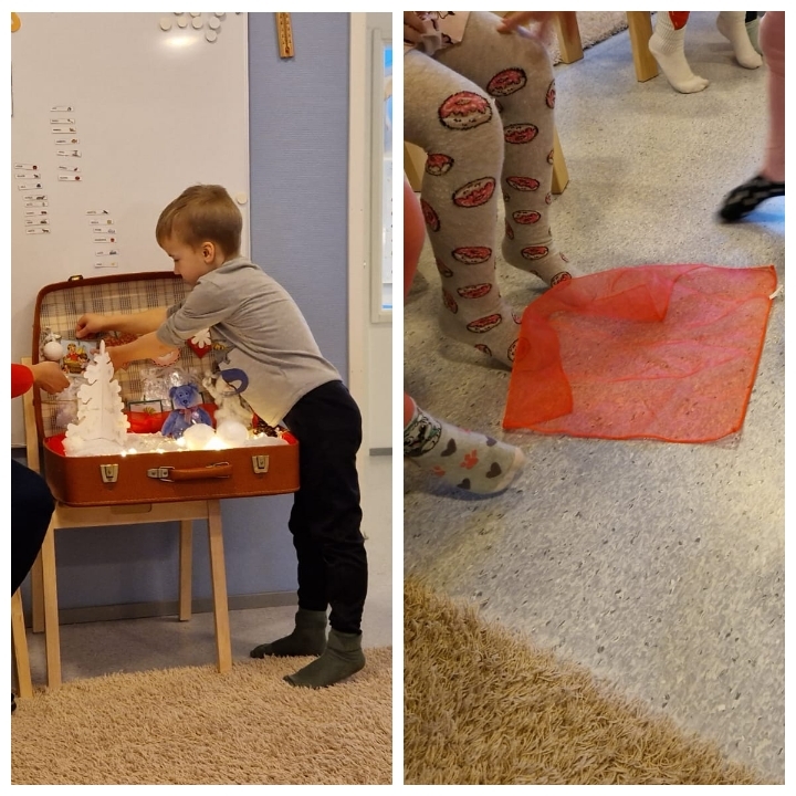 Saimme tänään vieraaksi Vauhtivarpaiden lapset, kun heidän opet ja hoitajat pitivät kevään suunnitteluaamun. Ulkoilimme päiväkodin pihassa ensin ja sitten meillä oli yhteinen muskari Puuhisten nukkarissa. Laululaukun saimme auki ja Kalle-kani hoiti tehtävänsä hyvin. Lauloimme ja leikimme mm. Lumiukkomarssin, Tule ystäväksi näin, Pakkasaamuna paleltaa, Huivitanssi. Hienosti meni yhteinen hetki :)