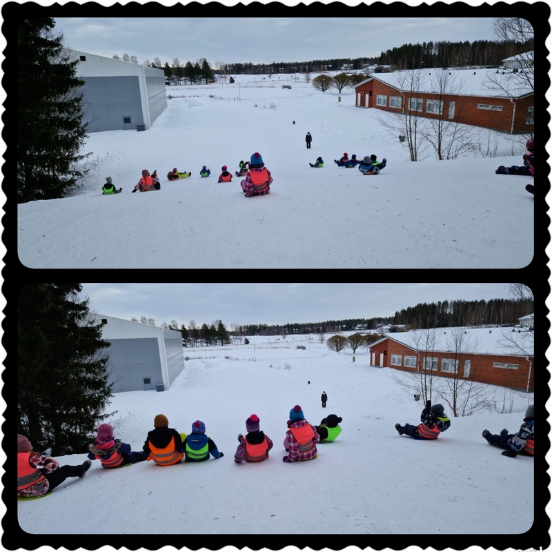 Aamulla yllätimme lapset ja lähdimme opiston mäkeen laskettelemaan. Mäki oli loistavassa kunnossa ja saimme pitkiä liukuja. Liikuntaa tuli mukavasti edestakaisesta kävelystä ja liki tunnin laskettelusta, jossa kivuttiin mäki ylös monta monituista kertaa, että taas päästiin laskemaan. Hauskaa oli ja nälkä tuli. Onneksi päiväkodilla odotti monen lapsen herkkuruoka makaronilaatikko.