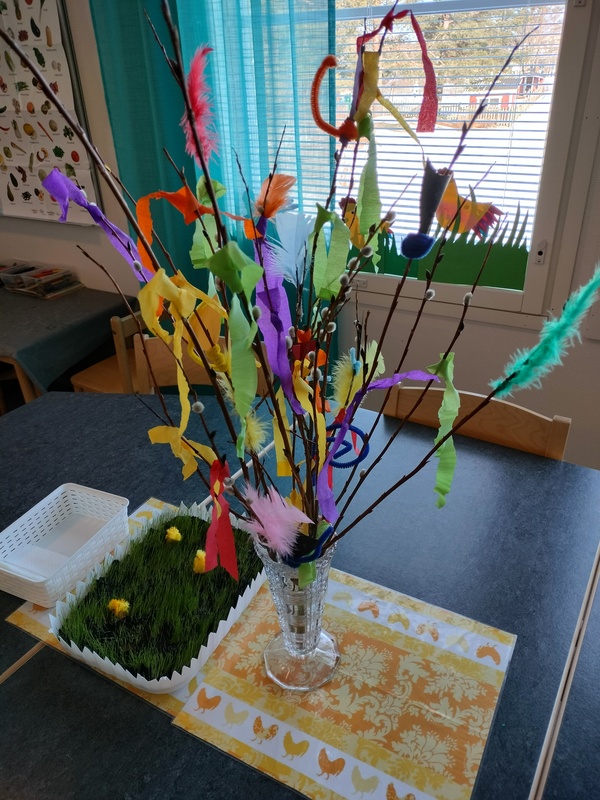 Aloitimme virpomisvitsojen valmistamisen ensi viikon virpomisretkeä varten. Lapset harjoitteli yksinkertaisen solmun tekemistä värikkäillä kreppipaperinauhoilla ja siinähän vaadittiinkin helliä ja näppäriä sormia :) Lisäksi lapset saivat askarrella pienet kisut pajunkissaoksien päihin höyhenten lisäksi.