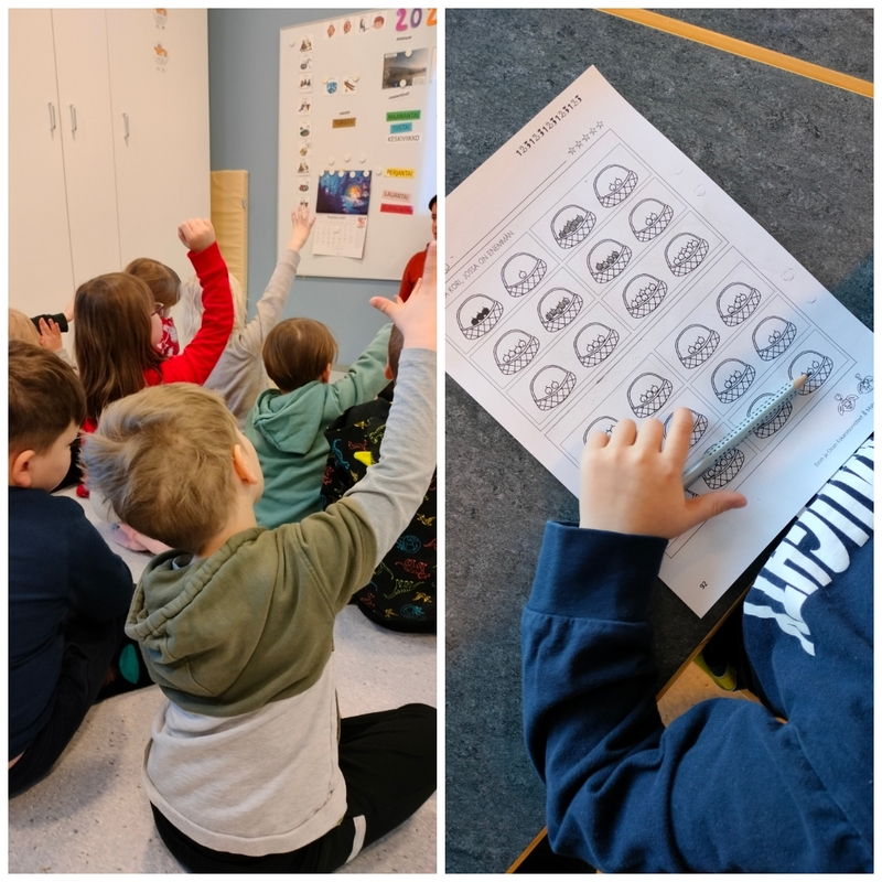 Noppakerhossa jatkoimme lukujono harjoituksia. Pohdimme myös mitä on enemmän ja vähemmän esineissä.Aluksi kertasimme lukujonot 1-10 ja toisinpäin 10-1. Sen jälkeen lapset harjoittelivat lukujonoja hyppien geolaattoja sekä laskien niitä saman aikaisesti. Oli hienoa huomata, että harjoittelun myötä lapset olivat edistyneet laskemaan lukujonoa 10-1. Joka viime kerralla olikin se haasteellisempi tehtävä.👍