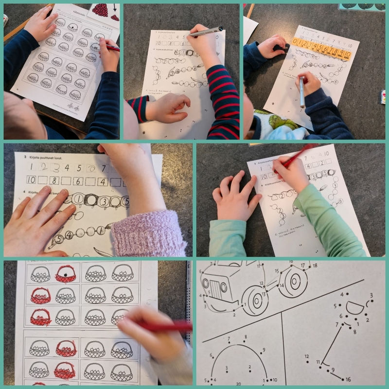 Kynätehtävissä lapset jatkoivat lukujonojen harjoittelua selvittämällä naapurilukujen avulla mitkä luvut puuttuivat lukusuorasta. Tässä tehtävässä oli mahdollista käyttää apuna "apupoikaa" eli lukusuorakorttia. Harjoittelimme myös pisteestä pisteeseen tehtäviä.