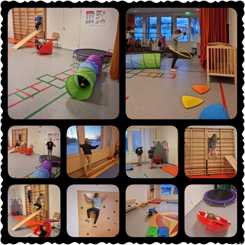 Aamu aloitettiin jumppasalissa touhuillen. Lapset saivat alkuun testailla eri välineitä, jonka jälkeen niistä tehtiin temppurata. Tätä kierrettiin sitten innoissaan pitkän aikaa ennen ja jälkeen aamiaisen. Monia karkeamotorisia taitoja vahvistettiin.
