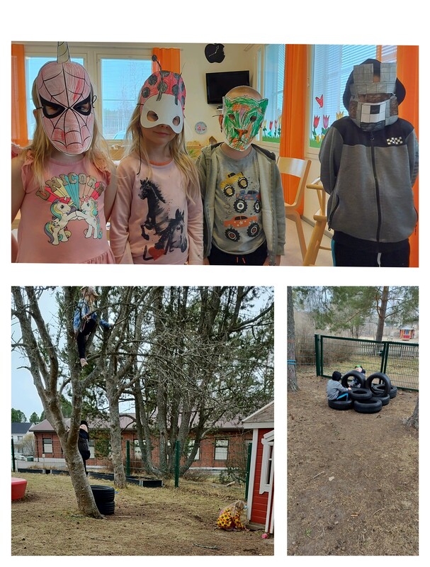 Ulkoleikkeissä kotileikkiä ja puuhun kiipeämistä. Paljon onnistumisia! 😊