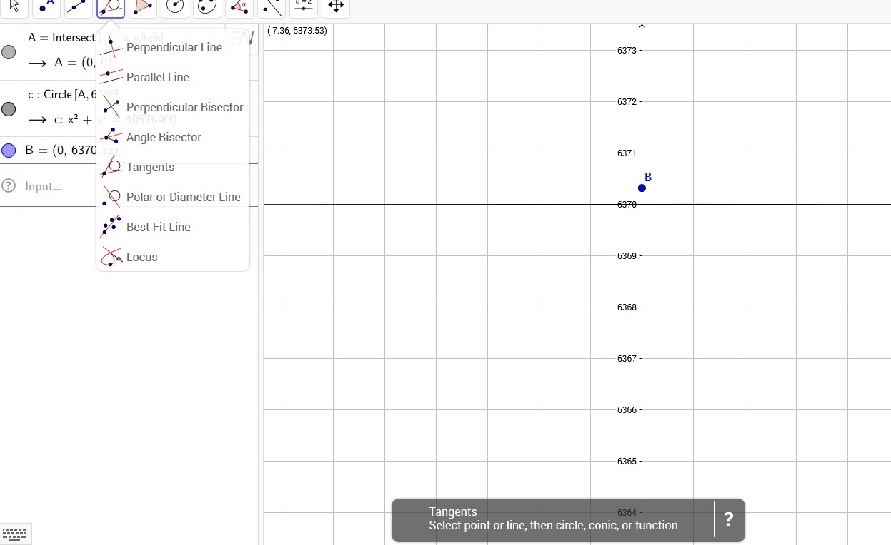 Ratkaise ympyrän ja saadun tangenttisuoran leikkauspiste. Tähän voit käyttää intersect (leikkauspiste)-työkalua. Tämä löytyy siitä palkista, missä oletuksena työkalu "piste" tai "point".
