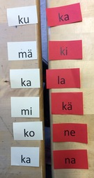 Tavulappujen lukemista kaverin kanssa, mitkä tavut muodostavat yhdessä sanan. Sanat kirjoitetaan Aapisvihkoon. Joku ehti keksiä ja kirjoittaa sanoista virkkeitä. Katselutila