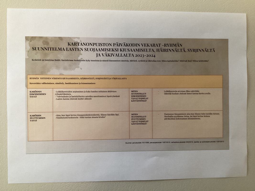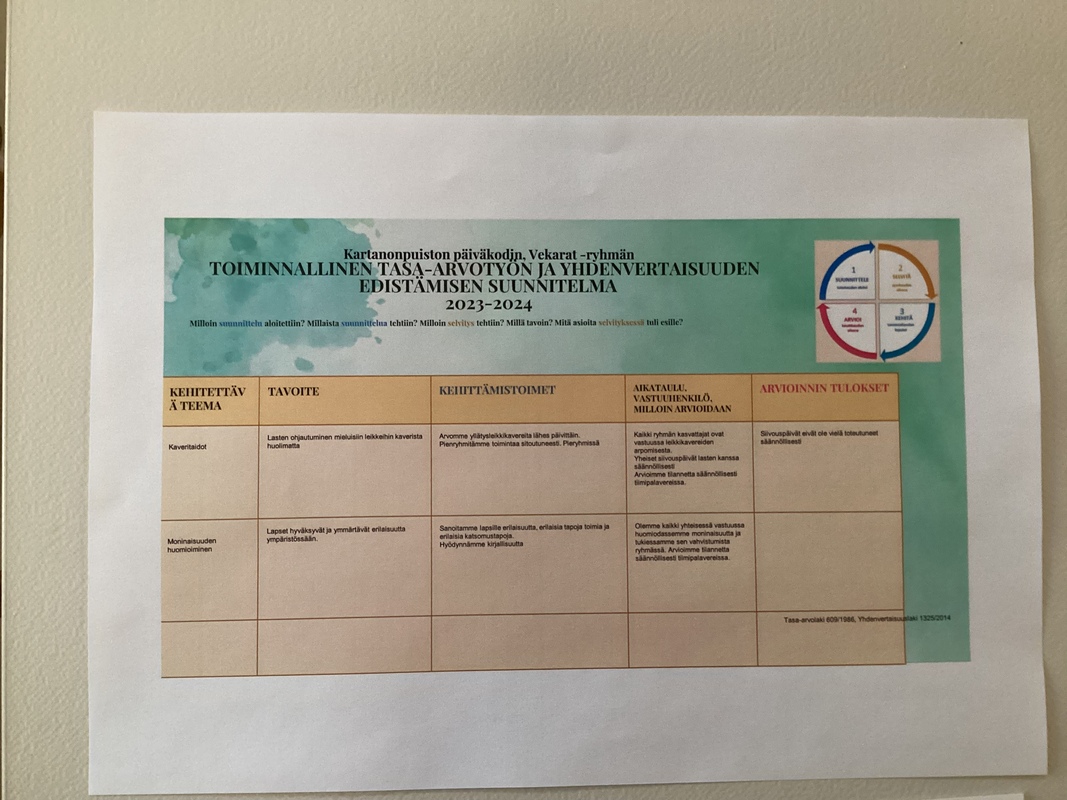 Kartanonpuiston päiväkodin, Vekarat -ryhmän TOIMINNALLINEN TASA-ARVOTYÖN JA YHDENVERTAISUUDEN EDISTÄMISEN SUUNNITELMA, sekä SUUNNITELMA LASTEN SUOJAAMISEKSI KIUSAAMISELTA, HÄIRINNÄLTÄ, SYRJINNÄLTÄ JA VÄKIVALLALTA 2023-2024