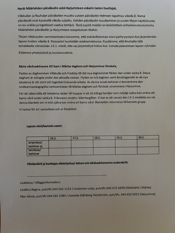 Mikäli lapsen huoltajat varaavat hoitoa tälle ajankohdalle, mutta eivät sitä tarvitse, hoito pitää perua viimeistään 15.12. Peruuttamatta jätetystä hoitovarauksesta kaupungilla on oikeus periä puolet täydestä varhaiskasvatusmaksusta. Tämä koskee myös maksuttoman varhaiskasvatuksen piirissä olevia perheitä (asiakasmaksutiedote 1.8.2024).