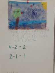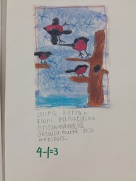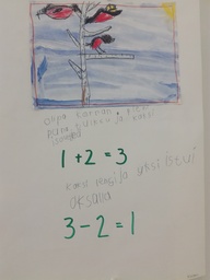 Laskutarinoita Katselutila Yhdistimme talven linnut, Kiva-tunnit, kuvataiteen, matemaattisen ajattelun ja luovan kirjoittamisen, syntyi laskutarinoita.