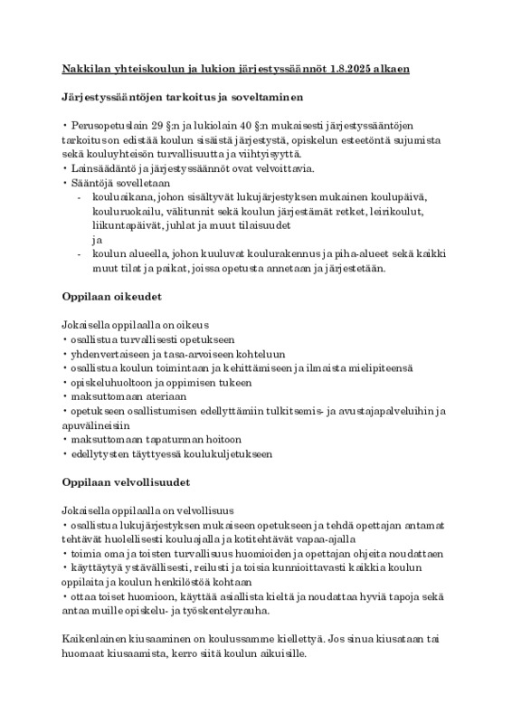 Nakkilan yhteiskoulun ja lukion järjestyssäännöt 1.8.2025 alkaen Jaa Sulje Tämän tiedoston tekstivastine: (tyhjä tekstivastine) Järjestyssäännöt 1.8.2025 alkaen.pdf 110.8 kt