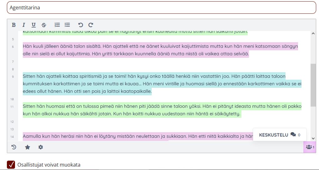 Muokkaustilassa näkee mitä kukin on kirjoittanut. Jokaisella oppilaalla on oma värinsä, jota voi muokata asetuksista.