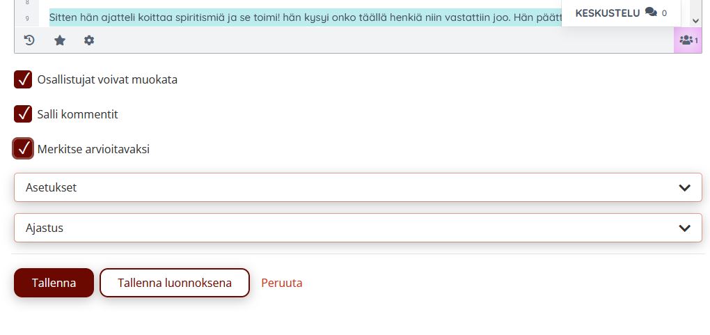 Ryhmämuistioon voi jättää päälle "Salli kommentit" ja "Merkitse arvioitavaksi".