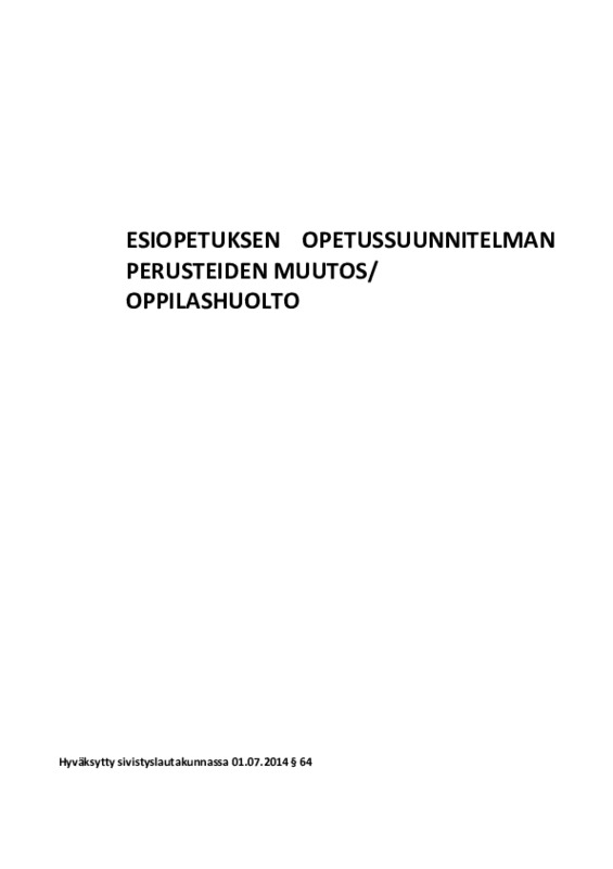 Esiopetuksen opetussuunnitelmamuutos oppilashuolto.pdf Jaa Sulje Tämän tiedoston tekstivastine: (tyhjä tekstivastine) Esiopetuksen opetussuunnitelmamuutos oppilashuolto.pdf 683.3 kt