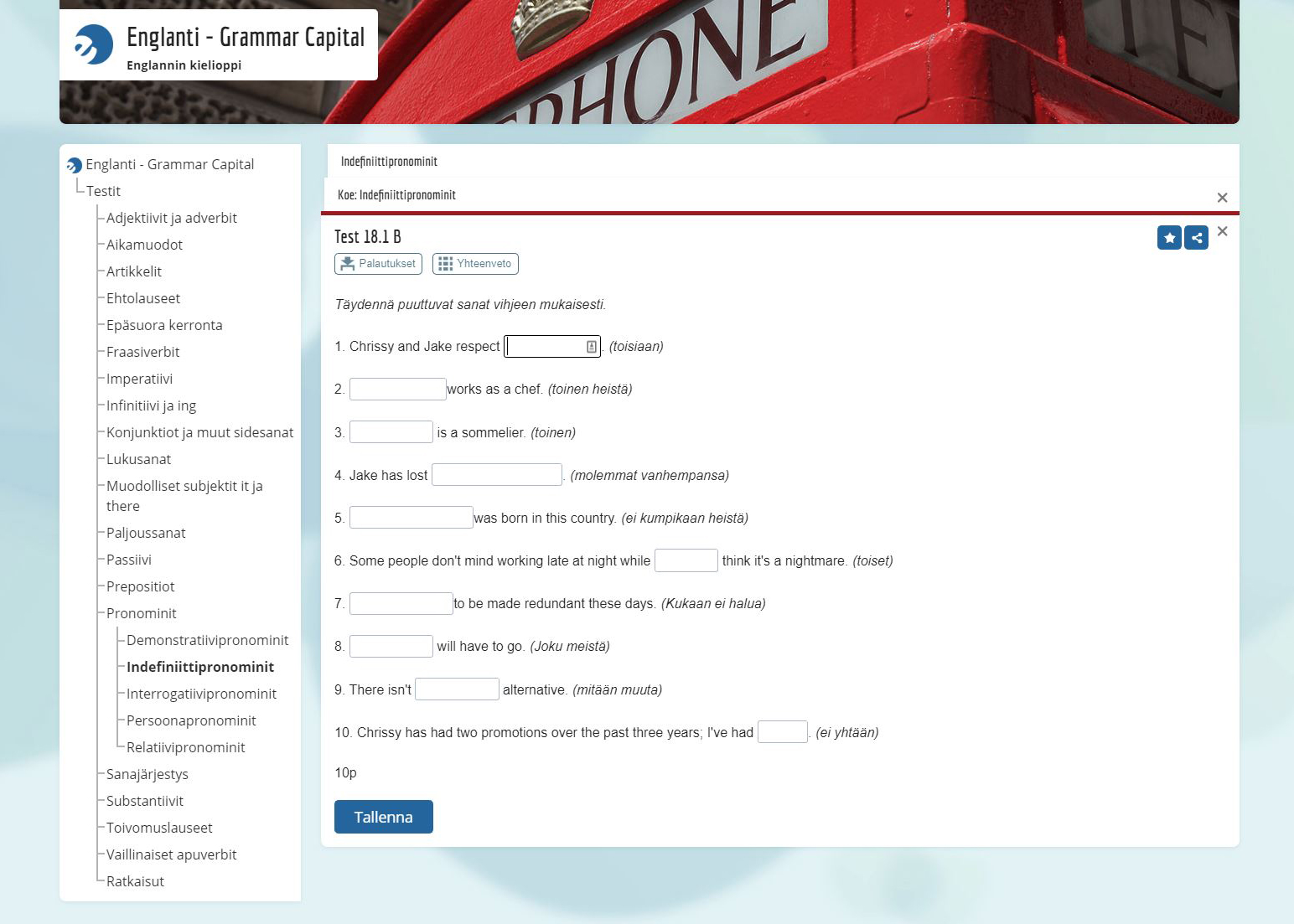 Jakaminen Sulje Grammar Capital sisältää myös testejä, joiden avulla opiskelija voi tarkastella kehittymistään. Pysyvä osoite https://peda.net/id/148ff99cb9e Pysyvä tiedoston latausosoite https://peda.net/id/148ff99cb9e:file/download/21d75e923cceb62aa608c77a382f3bb0d12eedd8/test-1.jpg Jakaminen muihin palveluihin Share this page to Facebook QR-koodi