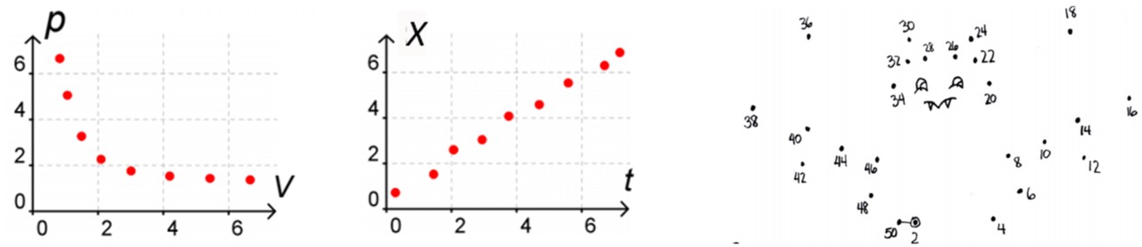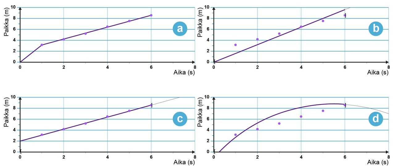 2. GRAAFISET TEHTÄVÄT Jaa Kuvaajien avulla mallinnetaan suureiden välisiä riippuvuuksia Lähtötasotesti - graafiset tehtävät (10 p.) Kirjaudu sisään lähettääksesi tämän lomakkeen 1. Kävelevän opiskelijan paikkaa mitattiin sekunnin välein. Mittauspisteet sijoitettiin (t,x)-koordinaatistoon. Mikä kuvaajista mallintaa liikettä parhaiten? a b c d 2. Valitse suureparit, joiden välillä on oletettavasti lineaarinen riippuvuus. (0,5 p / kohta, yhteensä 3 p) Aika ja nopeus putoamisliikkeen alkuvaiheessa Radioaktiivisen näytteen aktiivisuus ja aika Etanolin massa ja tilavuus Matka ja aika tasaisesti kiihtyvässä liikkeessä Koripalloon kohdistuva lattian tukivoima ja aika koripallon pompatessa Vastuksen sähkövirta ja jännite 3. Alla olevat kuvaajat esittävät suureiden välisiä riippuvuuksia. Mitä suureita ovat näiden kuvaajien integraalit? Liitä kuvaajan numeroon 1-6 jokin seuraavista vaihtoehdoista. a: matka b: nopeus c: kiihtyvyys d: nopeuden muutos e: energia f: impulssi g: momentti h: sähkövaraus 1: 2: 3: 4: 5: 6: Maksimi 10 p. Kirjaudu sisään lähettääksesi tämän lomakkeen