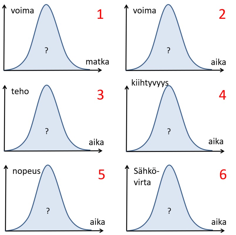 Lähtötasotesti - graafiset tehtävät (10 p.) Kirjaudu sisään lähettääksesi tämän lomakkeen 1. Kävelevän opiskelijan paikkaa mitattiin sekunnin välein. Mittauspisteet sijoitettiin (t,x)-koordinaatistoon. Mikä kuvaajista mallintaa liikettä parhaiten? a b c d 2. Valitse suureparit, joiden välillä on oletettavasti lineaarinen riippuvuus. (0,5 p / kohta, yhteensä 3 p) Aika ja nopeus putoamisliikkeen alkuvaiheessa Radioaktiivisen näytteen aktiivisuus ja aika Etanolin massa ja tilavuus Matka ja aika tasaisesti kiihtyvässä liikkeessä Koripalloon kohdistuva lattian tukivoima ja aika koripallon pompatessa Vastuksen sähkövirta ja jännite 3. Alla olevat kuvaajat esittävät suureiden välisiä riippuvuuksia. Mitä suureita ovat näiden kuvaajien integraalit? Liitä kuvaajan numeroon 1-6 jokin seuraavista vaihtoehdoista. a: matka b: nopeus c: kiihtyvyys d: nopeuden muutos e: energia f: impulssi g: momentti h: sähkövaraus 1: 2: 3: 4: 5: 6: Maksimi 10 p. Kirjaudu sisään lähettääksesi tämän lomakkeen