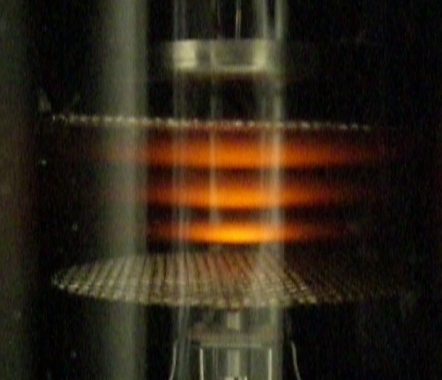 Franckin ja Hertzin koejärjestely on toteutettavissa myös muilla kaasuilla. Valokuvassa näkyy neonkaasun lähettämää oranssinpunaista valoa alhaalla olevan katodin C ja keskellä olevan verkkomaisen elektrodin A välissä.
