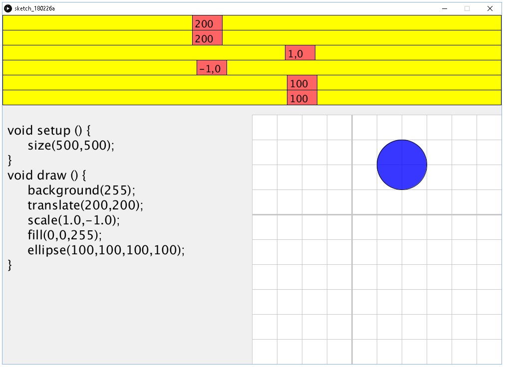 Tämä simulaatio havainnollistaa koordinaatiston skaalausta ja peilausta scale(x,y); -komennolla. Kopioi alla oleva koodi ja aja ohjelma. Älä tee koodiin muutoksia.