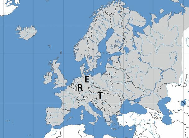 Kartta: Euroopan joet. R = Rein, E = Elbe, T = Tonava.
