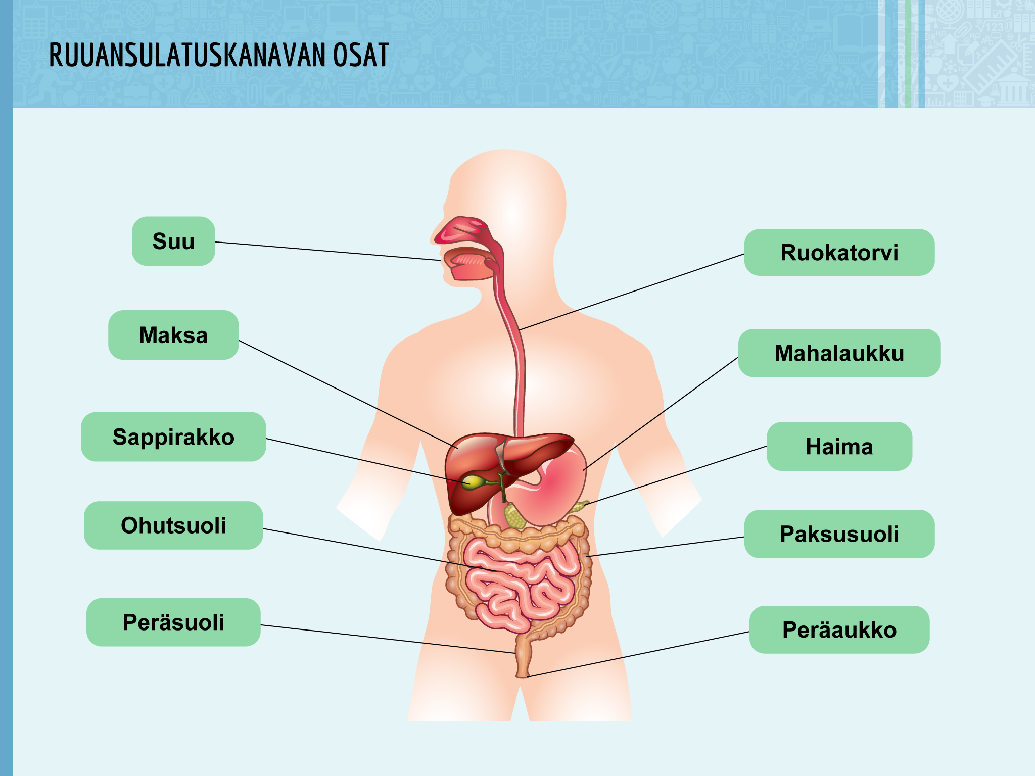 Jakaminen Sulje Ruuansulatuskanava alkaa suusta ja päättyy peräaukkoon. Kanavaan erittyy sylkeä ja entsyymejä elimistä. Pilkkoutuneet ravintoaineet ja vesi imeytyvät suolistosta verenkiertoon. Pysyvä osoite https://peda.net/id/cb77cea4deb Pysyvä tiedoston latausosoite https://peda.net/id/cb77cea4deb:file/download/df8a54e214636b65477afa09f954d35d8cfd1a95/ruuansulatuskanavan-osat-slide.png Jakaminen muihin palveluihin Share this page to Facebook QR-koodi