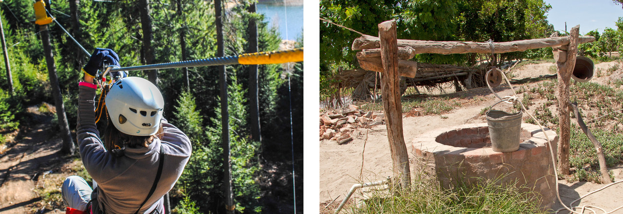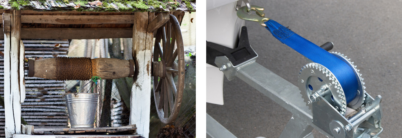 Vasemmalla: Köysiratalaskettelijan väkipyörä on kevyt mutta kestävä. Oikealla: Perulaisessa kaivossa ämpäri on noussut ylös, vaikka narua on vedetty sivulle.
